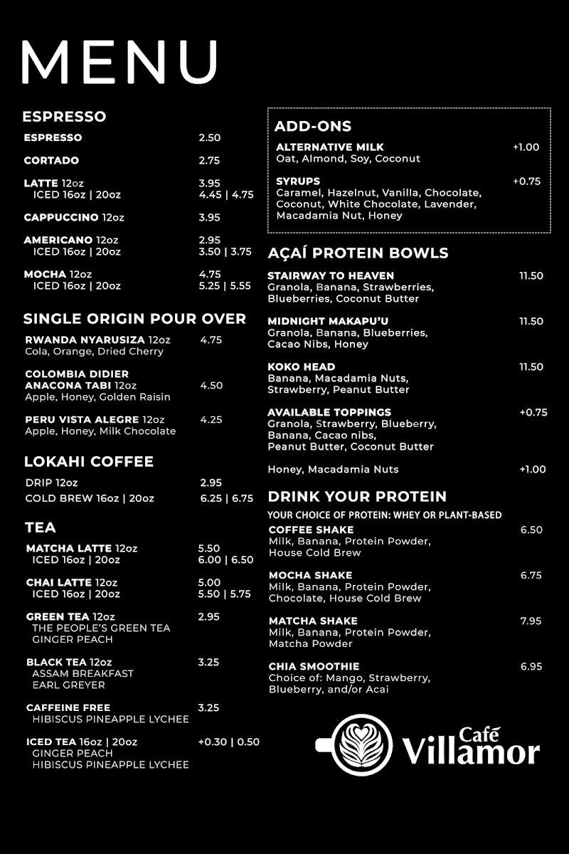 At Cafe Villamor, the menu’s heart is its vibrant acai bowl selection, perfect for a refreshing, health‑focused treat in Honolulu’s Kaka’ako. Standouts include the Stairway to Heaven - US$11.50 bowl, a layered mix of rich acai and fresh toppings that feels indulgent yet balanced; the Midnight Makapu’u - US$11.50, which brings a deeper, fruit‑forward profile to the table; and the Koko Head - US$11.50, a boldly flavored option that’s become a go‑to for regulars seeking both taste and texture. Each bowl reflects the café’s commitment to quality and creativity, with acai blended in‑house for a protein‑rich, satisfying experience that’s as visually appealing as it is delicious. Whether enjoyed as a post‑workout pick‑me‑up or a leisurely breakfast, these bowls encapsulate the casual yet thoughtful essence of the café’s menu.